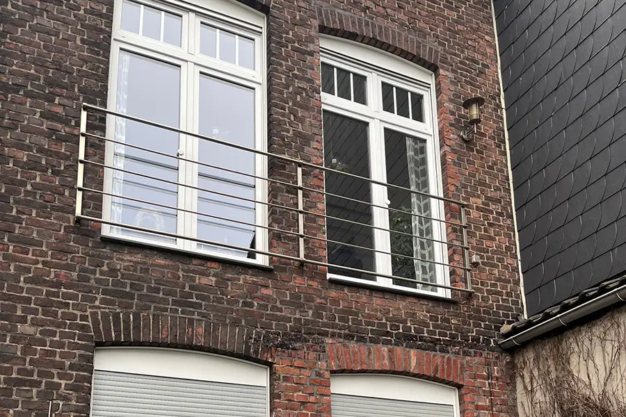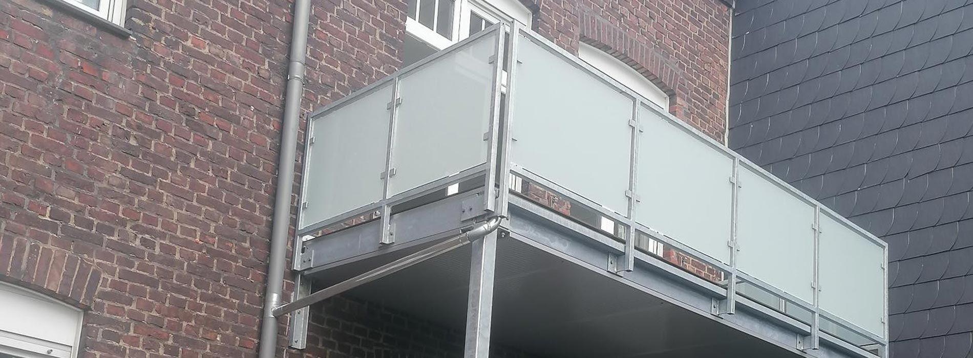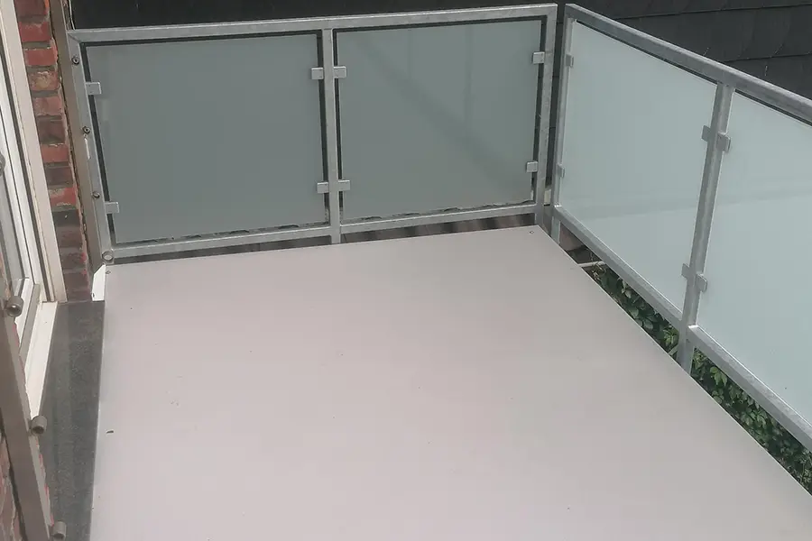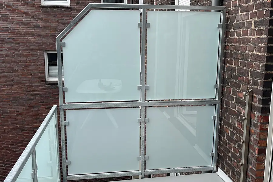 Die Verglasung umfasst ein Geländer mit integrierter Sichtschutzwand. Die Geländerfüllung besteht aus Verbundsicherheitsglas mit mattweißer Folie, gehalten von bauaufsichtlich zugelassenen Glashaltern.