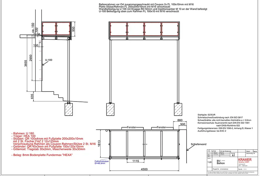 Das Aufmaß erfolgte händisch. Der Rahmen besteht aus U 180, die Träger aus HEA 100 und die Stützen aus QR 100×4 mm mit Fußplatten 200×200×10 mm, befestigt mit zwei Fischer FAZ II 12×125 mm. Die Rahmenverschraubung erfolgt als Coupon zwischen Rahmen und Stütze mit 2 × M16. Das Geländer besteht aus QR 40×3 mm mit Fußplatte 150×120×10 mm. Der Gitterrost ist mit Tragstäben 30×2 mm und einer Maschenweite von 30×30 mm ausgeführt. Als Belag kommt eine 8 mm Fundermax-Bodenplatte ‚HEXA‘ zum Einsatz.