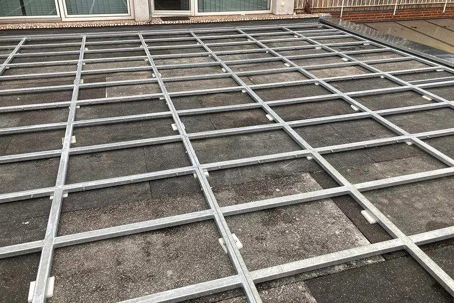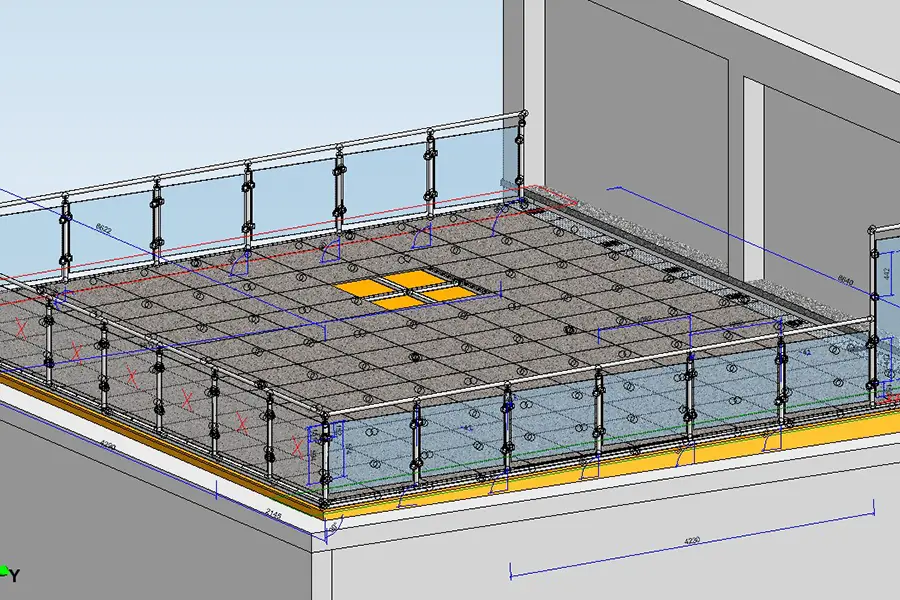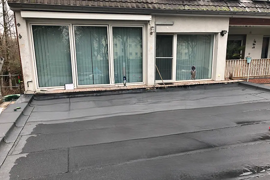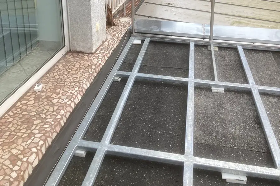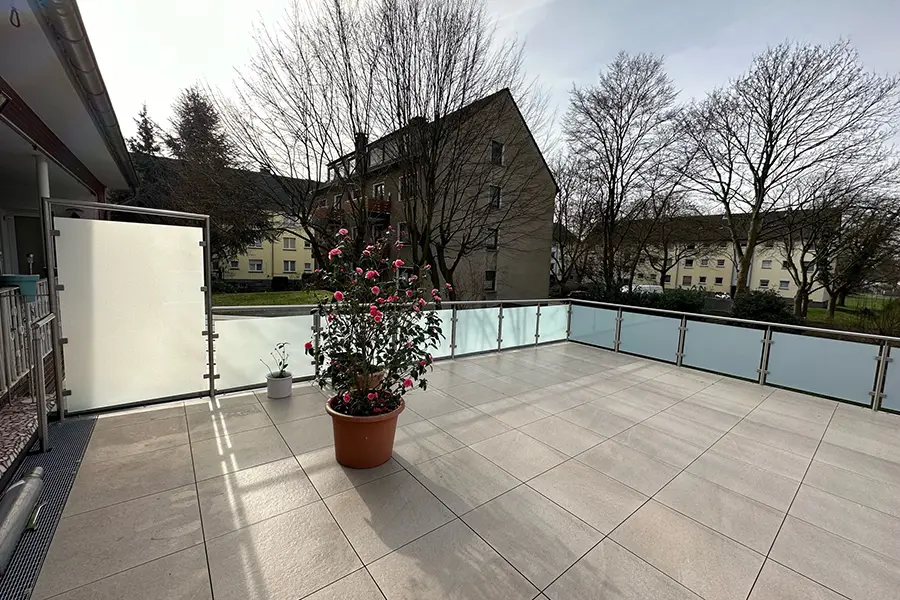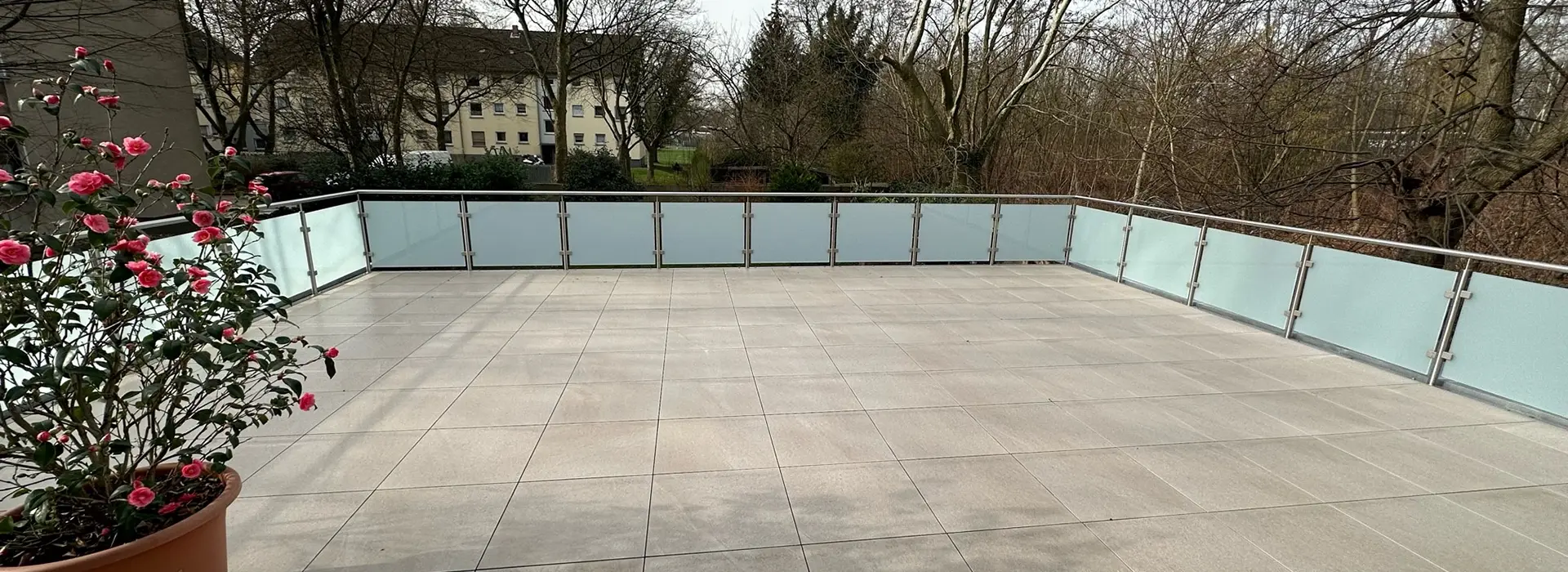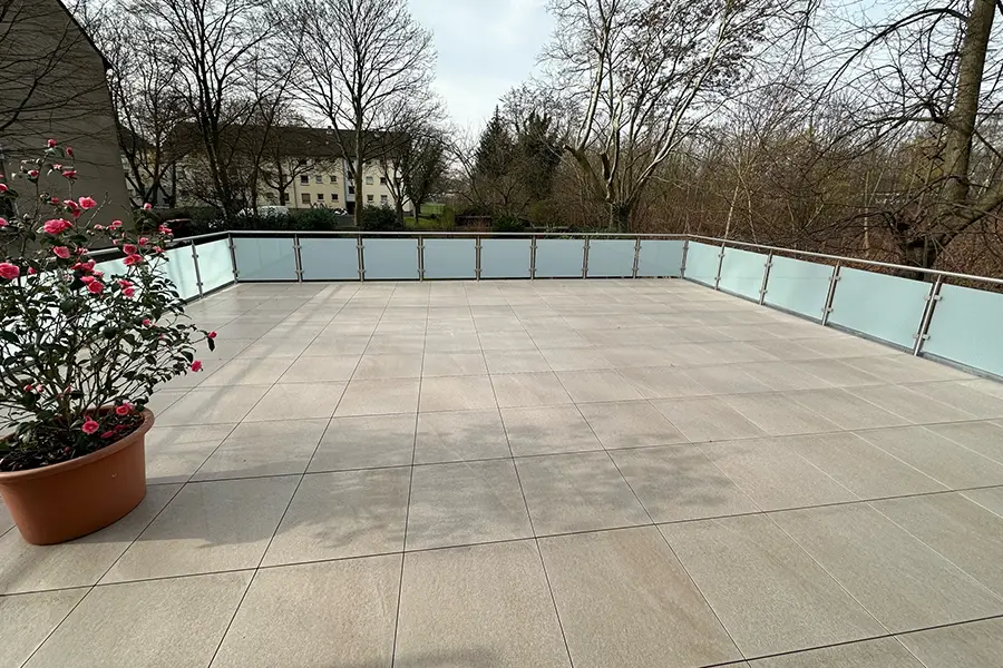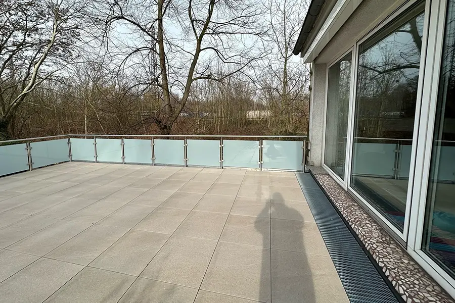 Umfassende Sanierung einer Terrasse – das heißt, nicht lediglich ein Austausch des Bodenbelags, sondern eine ganzheitliche Erneuerung inklusive Geländer mit Sichtschutz, Unterbau, Abdichtung und neuer Auflage.